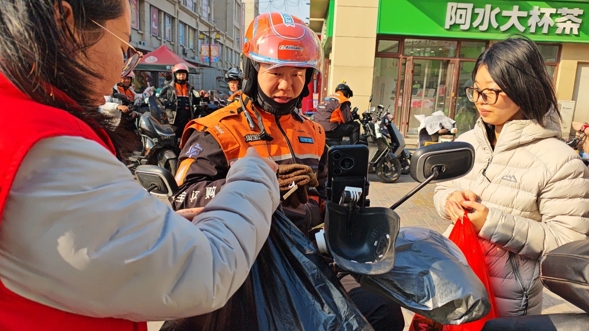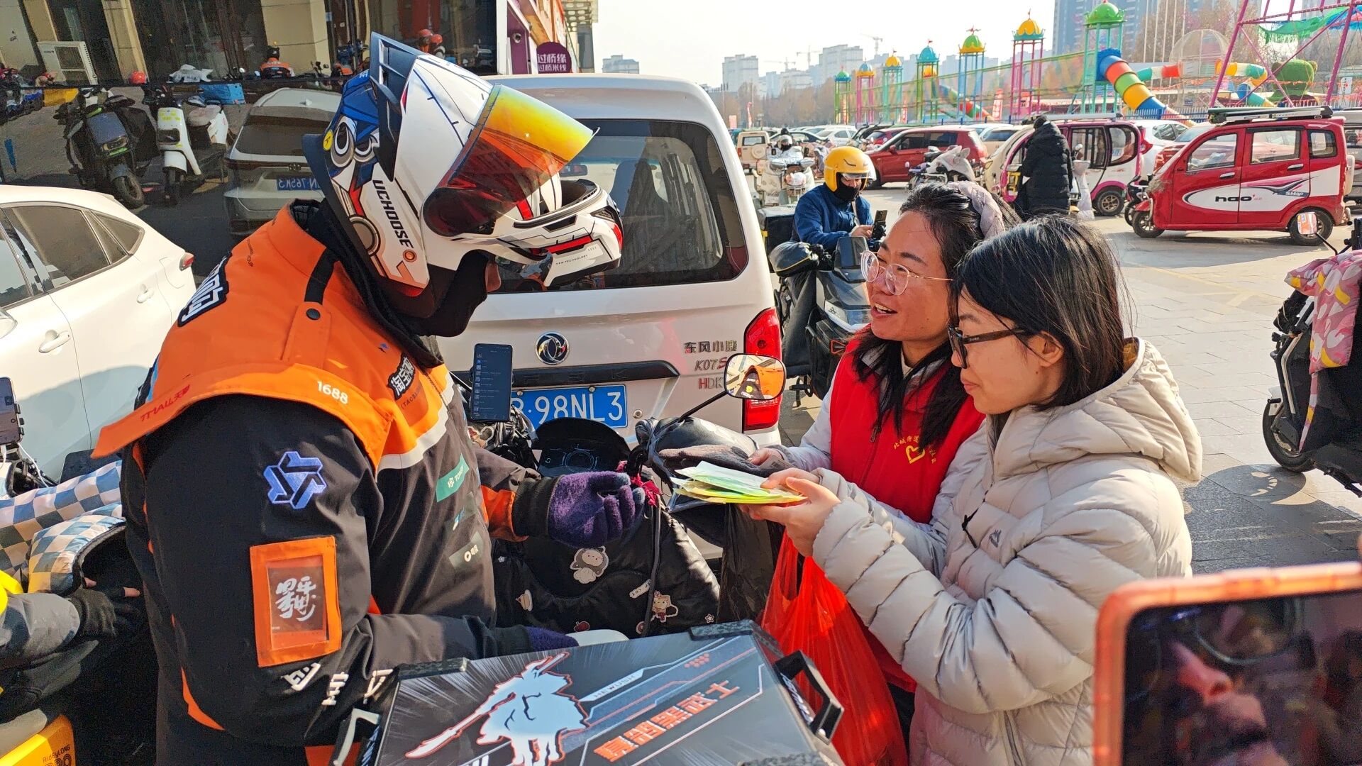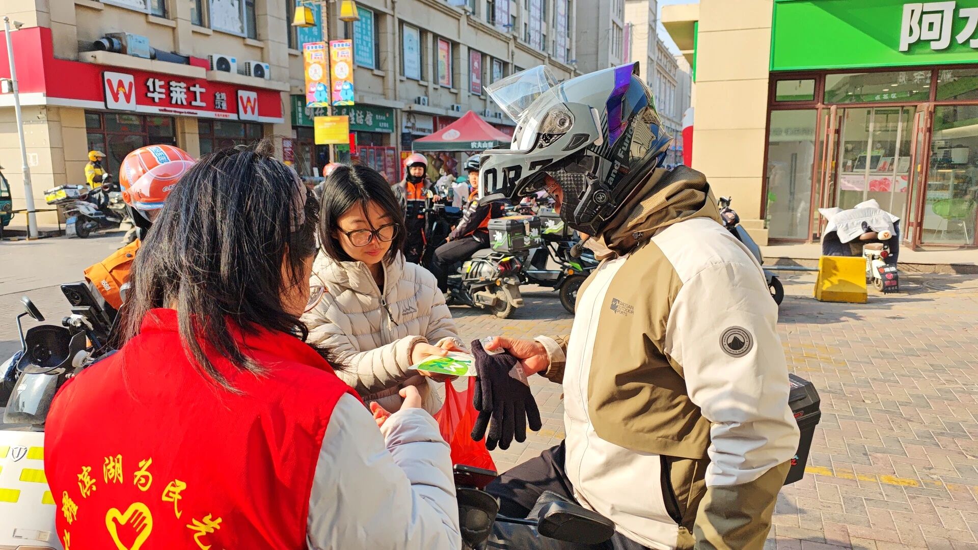 北城街道滨湖社区新时代文明实践站开展“寒风有界,温暖无界-滨湖社区致敬新就业群体”活动,为新就业群体送上保暖用品。