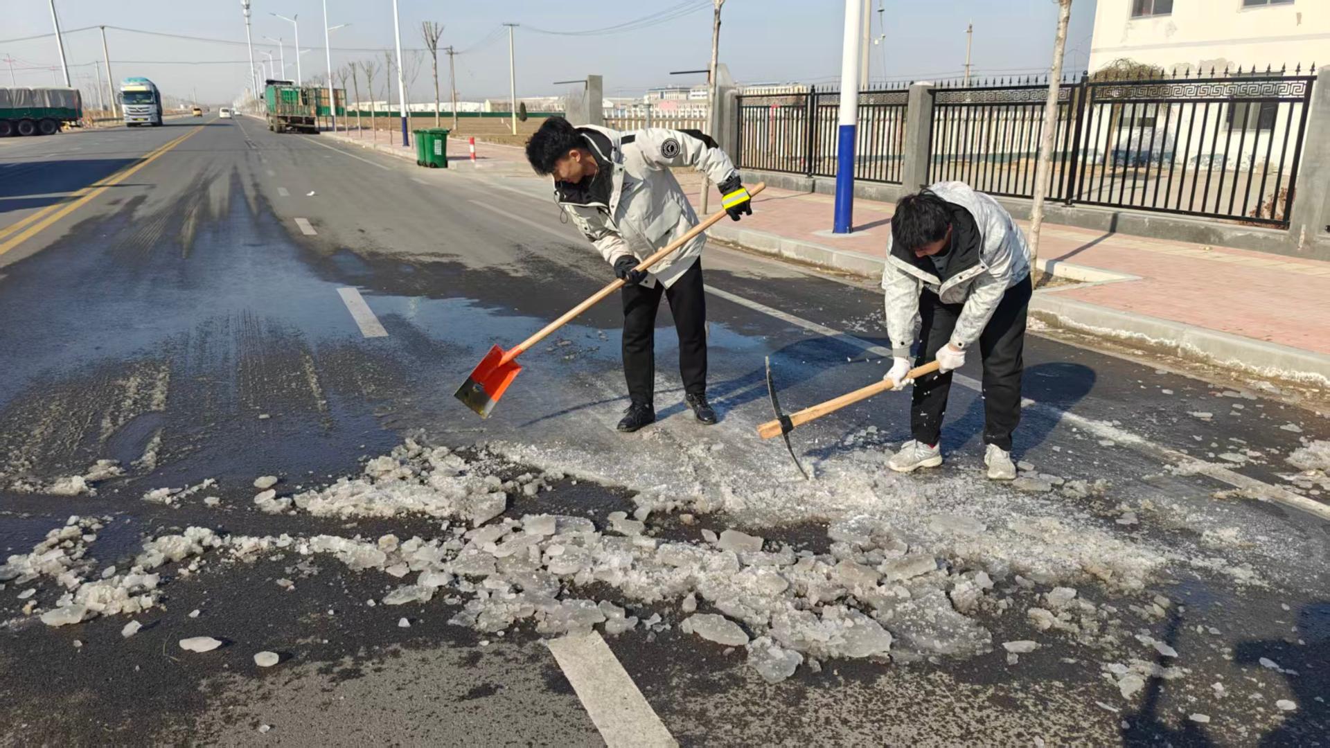 宋楼镇新时代文明实践所清理敬老院门口路面结冰,为群众出行筑牢安全防线。宋楼镇新时代文明实践所迅速行动起来,组织了一批志愿者携带清冰工具赶到现场。志愿者们分工明确,有的负责用铁锹铲除较厚的冰层,有的用扫帚清扫碎冰。