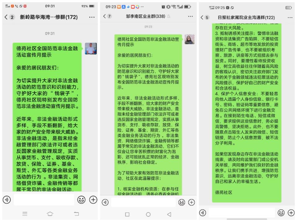 社区还充分利用线上平台扩大宣传覆盖面。通过社区微信群定期推送防范非法金融活动的知识文章、视频等内容,方便居民随时学习了解。同时,鼓励居民积极转发分享,形成“人人知晓、人人防范”的良好氛围 。