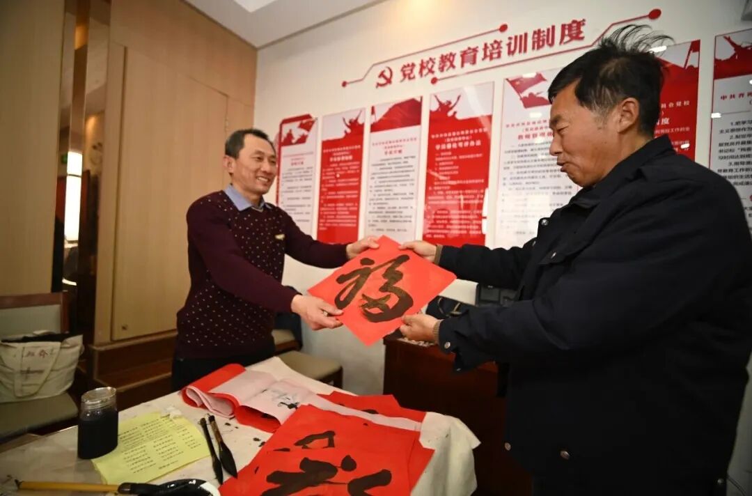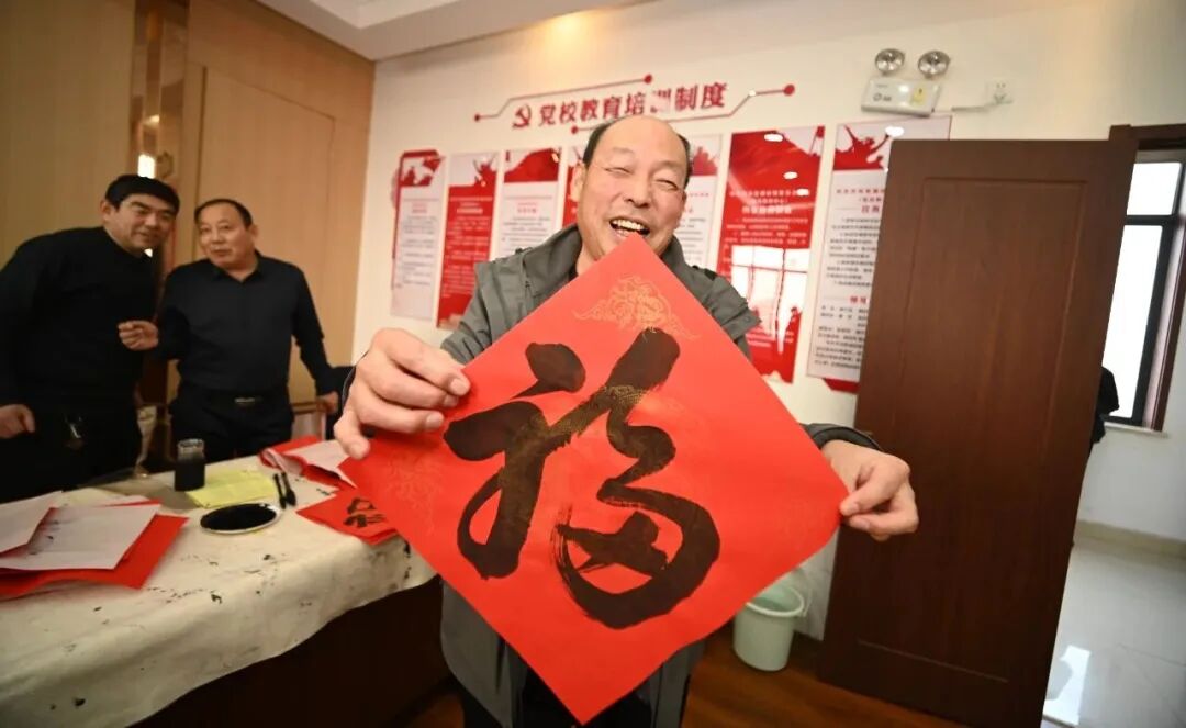 舞台正后方,一片安静的“红”与“黑”,散发着另一重暖意。书法家们挥毫泼墨,手腕起落间,一个个饱满的“福”字、一副副吉祥的春联跃然纸上。“县文联组织的这次活动特别有意义看到大家这么热情,心里非常激动。书法家张福涛边说边笑着将写好的福字递给了身旁的群众。张玉标向记者展示着刚领到的福字,脸上笑开了花:“早些年,都是求村里老先生写。后来图省事,都买印好的。今天拿到这手写的,一下子年的味道就回来了。