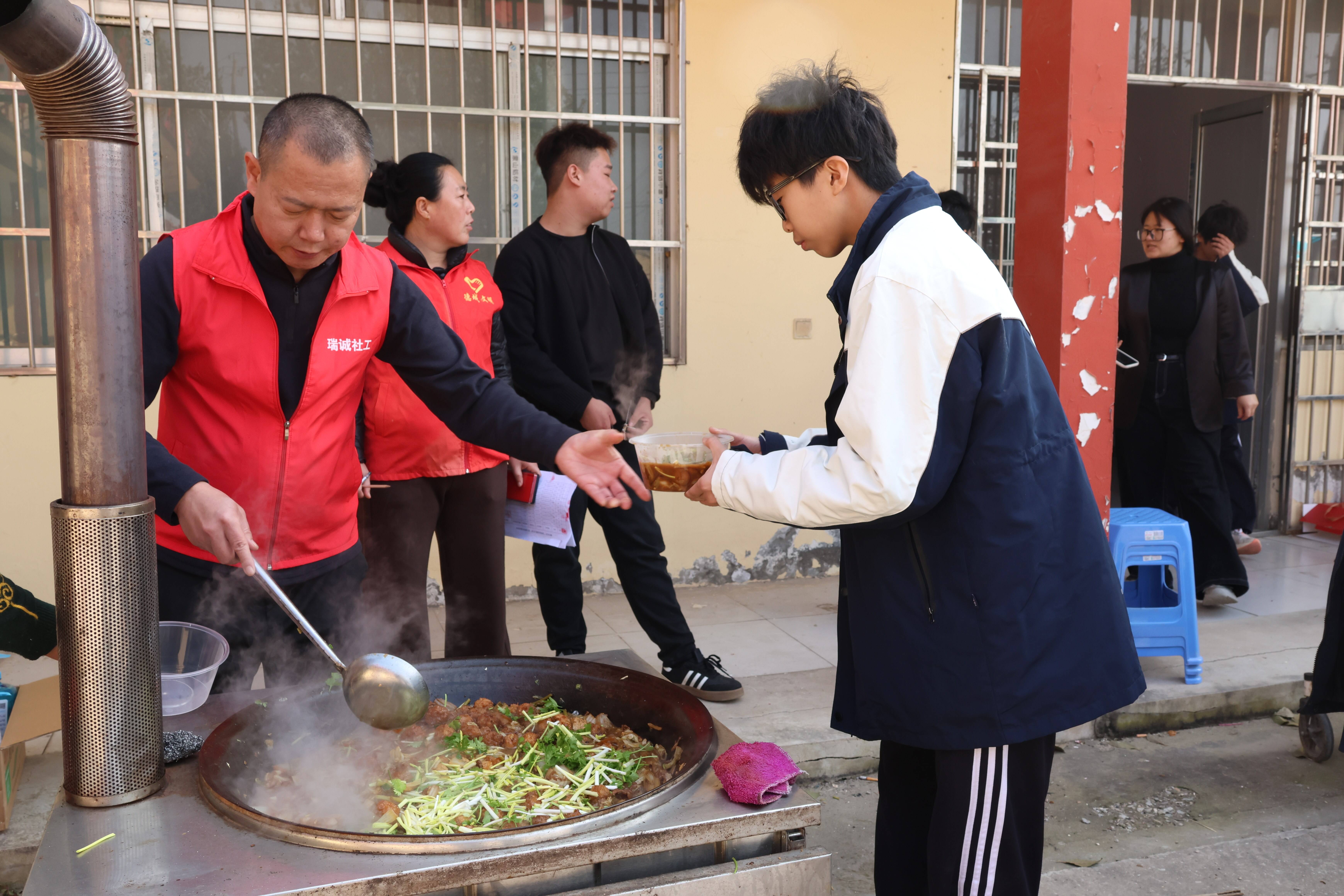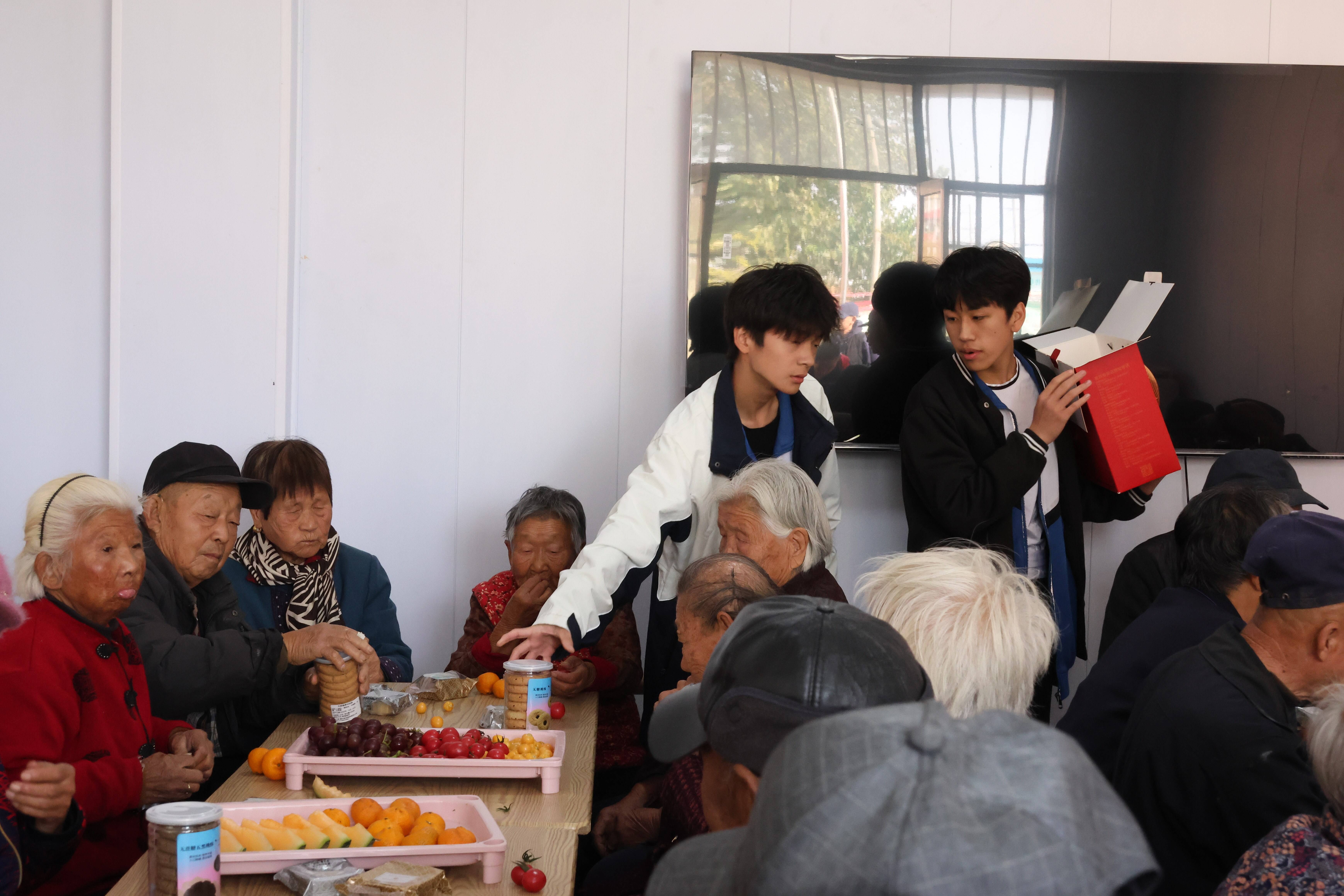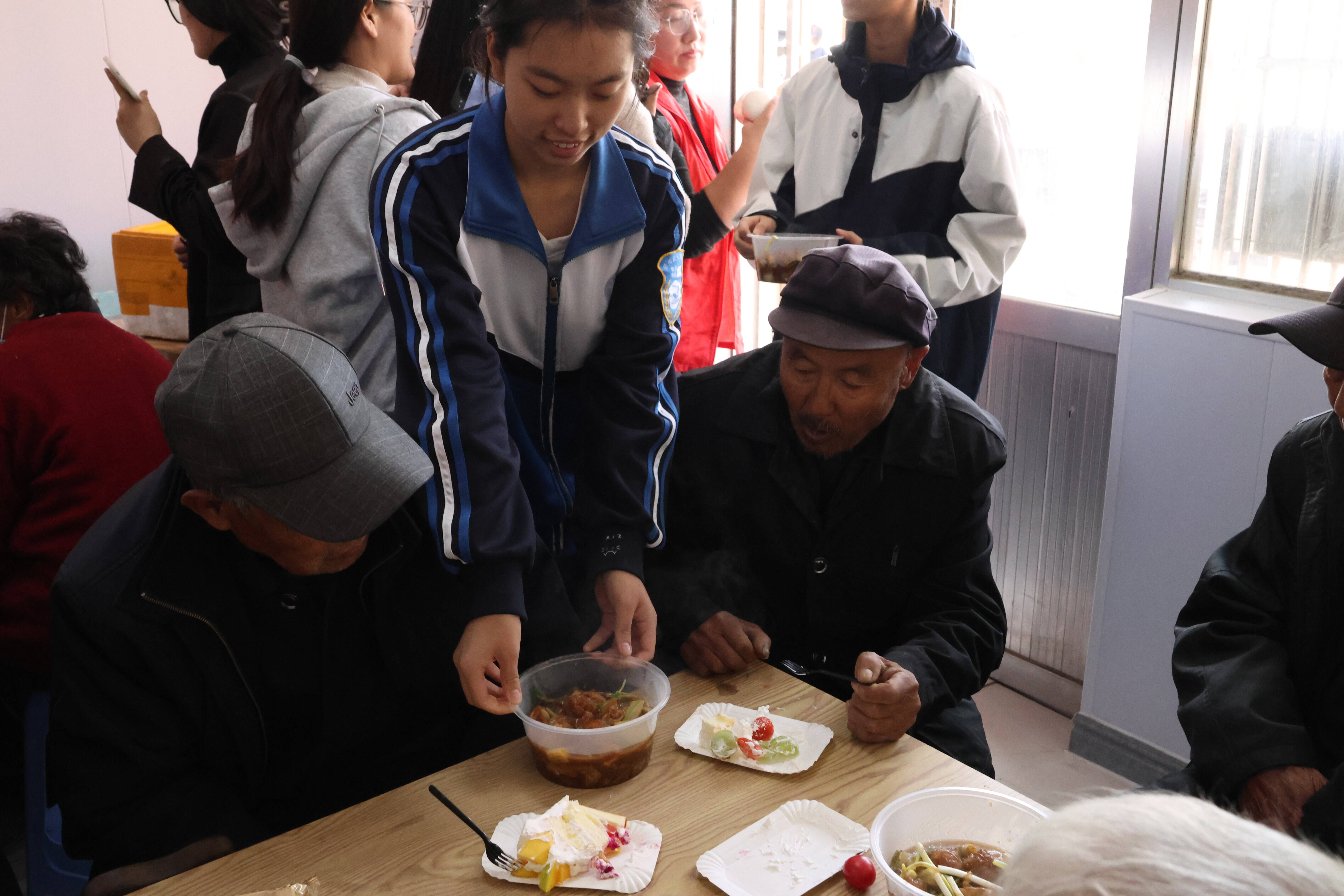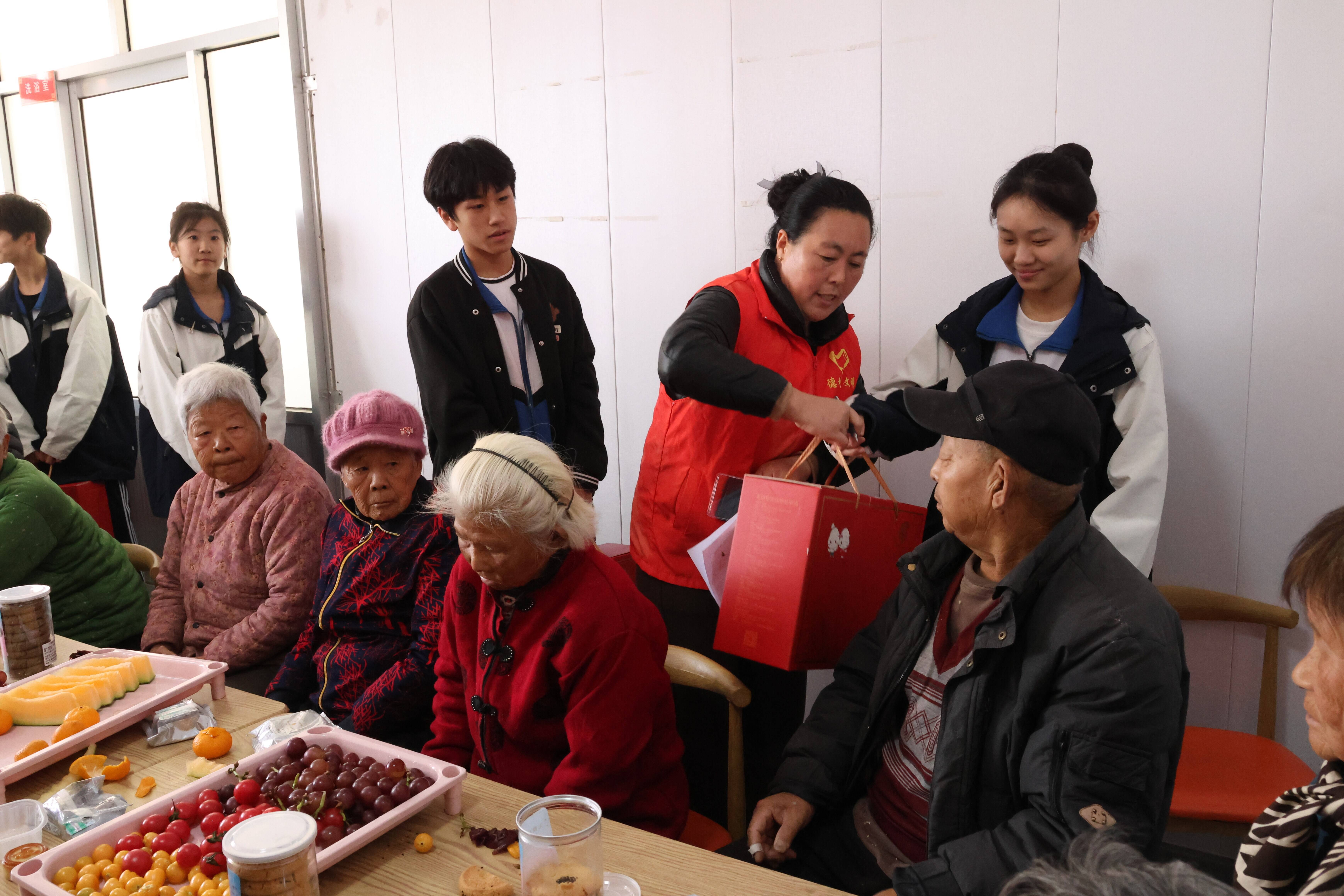 在重阳敬老的暖意里,同学们的服务身影同样动人。他们为老人送上水果,甜润晚年时光;捧来糕点,寄去“重阳安康”的美好祝愿;端上热饭,暖透岁月风霜;稚嫩的双手,或搀扶老人安稳就座,或静听老人忆往谈今……上午的服务时光里,孩子们以点滴行动,让敬老的温情在社区缓缓流淌,为这个重阳佳节绘就一幅满是暖意的画卷。