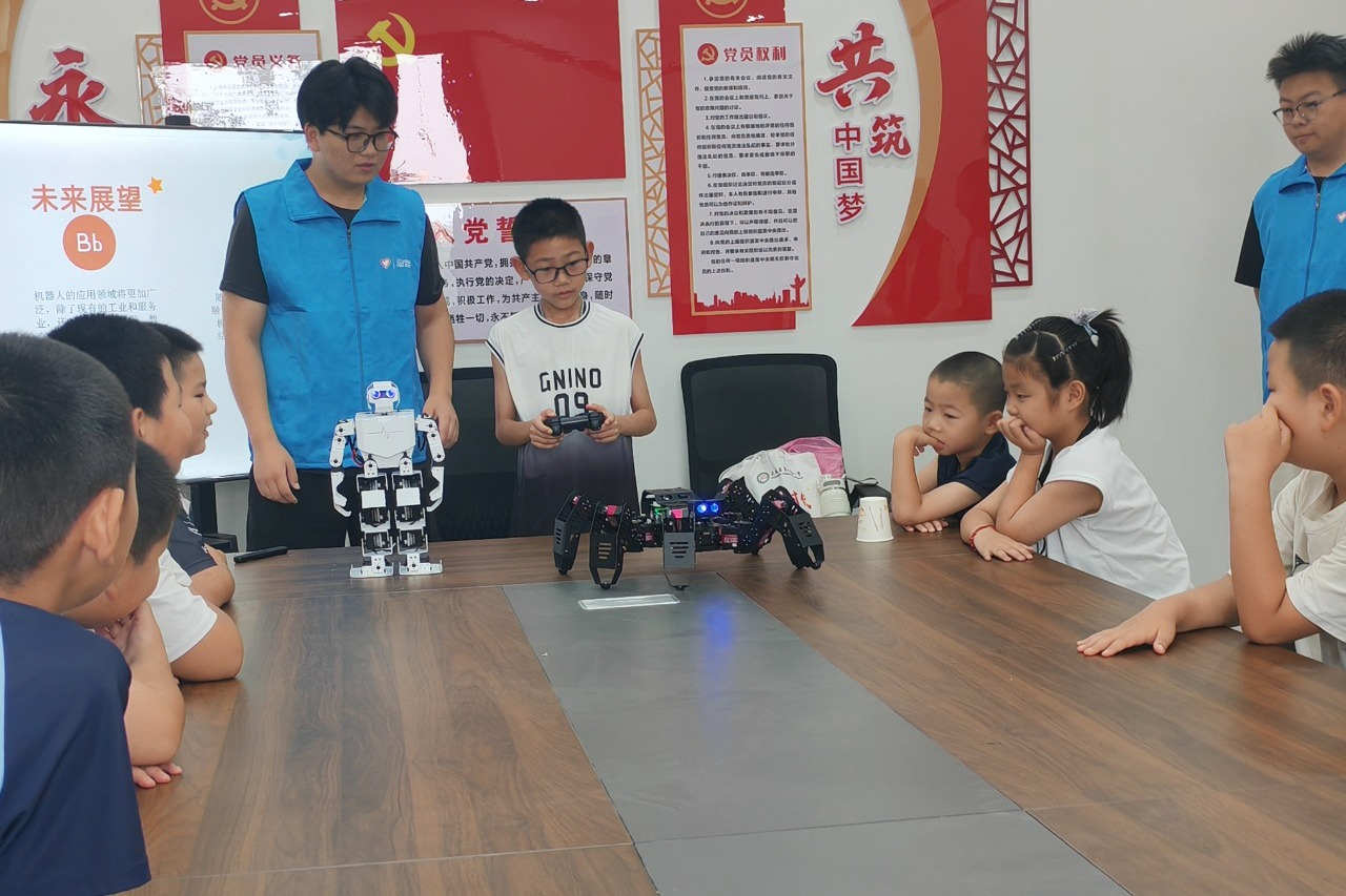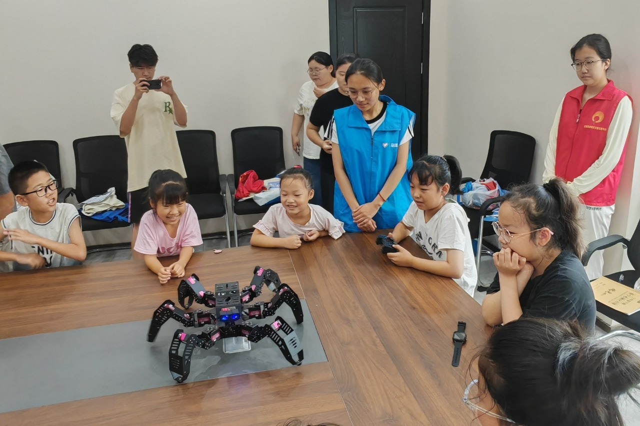 量子星火”志愿服务队的志愿者们首先带领孩子们开启了编程机器人的奇妙之旅。志愿者们用生动易懂的语言讲解了编程的基本原理和机器人的运作方式。