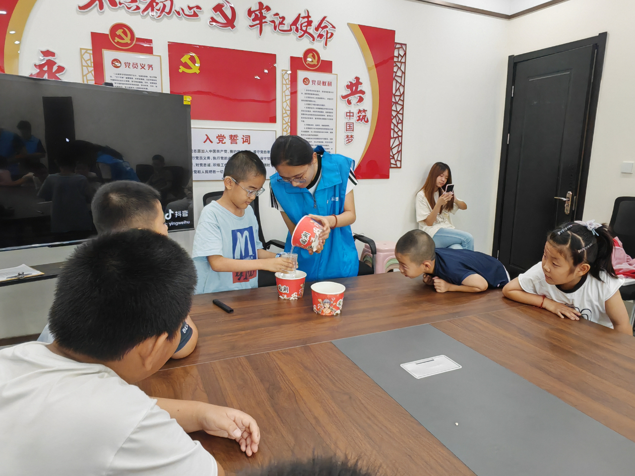 社区提前备好的各种实验材料一字排开,志愿者们边演示边讲解。看着小球在不同液体里一会儿沉一会儿浮,孩子们的好奇心被勾得足足的,“为什么这个球会浮起来呀?”“那个液体里的球怎么沉下去了?” 问题一个接一个。大家在玩中学,轻松 get 科学小知识~