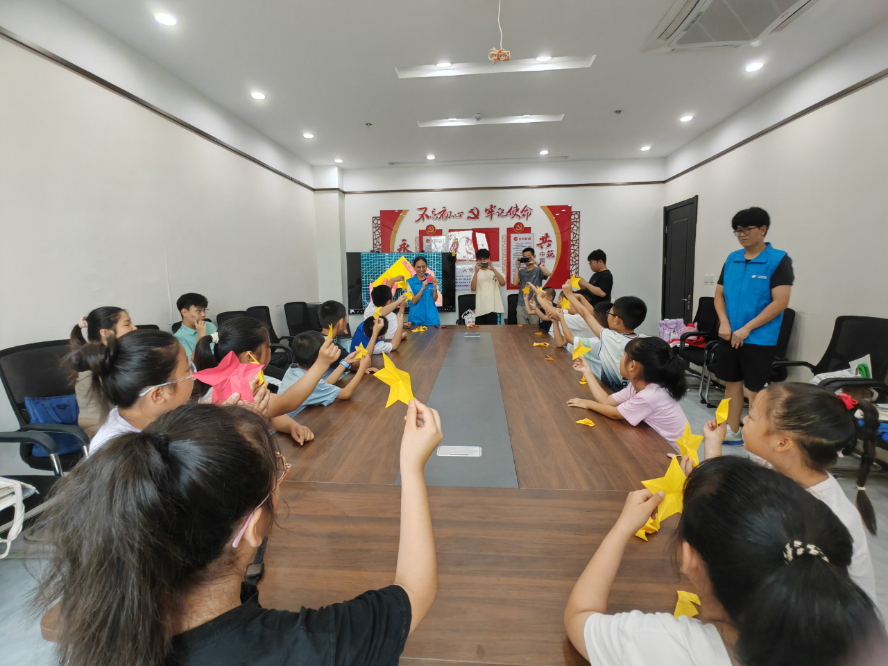 最后登场的剪纸五角星环节,满满都是传统文化的味道。志愿者和社区工作人员一起,手把手教孩子们折纸、裁剪。“你看我剪的五角星!”“我的这个也超好看!”不一会儿,一个个五角星就诞生了,孩子们举着自己的作品到处炫耀,脸上的笑容比星星还亮~